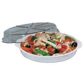 CHEESECAKE ANYONE?These handy trays are perfect for pies, brownies; omelets, quiche, stir fry, veggie platter and yes Cheesecake. The trays make a great plate cover for reheating a dinner plate or as a dinner plate itself.The spoke design on the bottom elevates trays off the oven floor allowing for better air circulation and reduction of heat absorption by the glass or ceramic oven tray. The spoke design can be used as an imprint/cutting guide for even portions.The handles off set from each other to allow the trays to seal during cooking and to trap in the heat and steam. This also allows for easy opening after cooking. Either tray can be used as a lid or base. Tray may also be used as a cover with the MM-30 Cake pans or combined with them for two tier cooking. For hamburgers or chicken pieces, add 13005 Mini Rax.